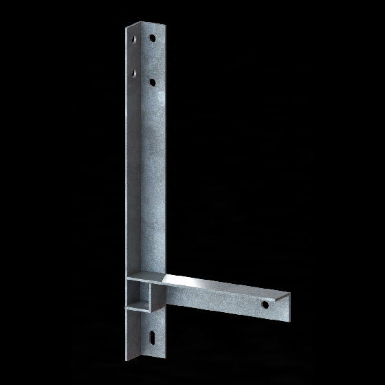 Bayoneta sencilla de alineamiento tipo L de 2 m compuesta por 1 perfil en L principal y 2 perfiles soldados para formar la figura indicada en la imagen, galvanizada en caliente, en el ancho y espesor de perfil en L de su preferencia. Se realizan fabricaciones especiales con la cantidad y diámetro de perforaciones que se requieran.