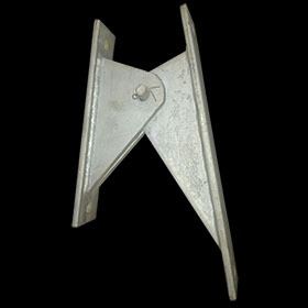 Bisagra pie de amigo basado en norma EMCALI NM-14 elaborado en platinas de acero de 3/8" o 1/2" galvanizado en caliente. Elemento de unión y apoyo en una retenida entre dos postes cuando el sitio no permite la ubicación o permanencia de otro tipo de templete. Se unen a cada poste por medio de collarines.