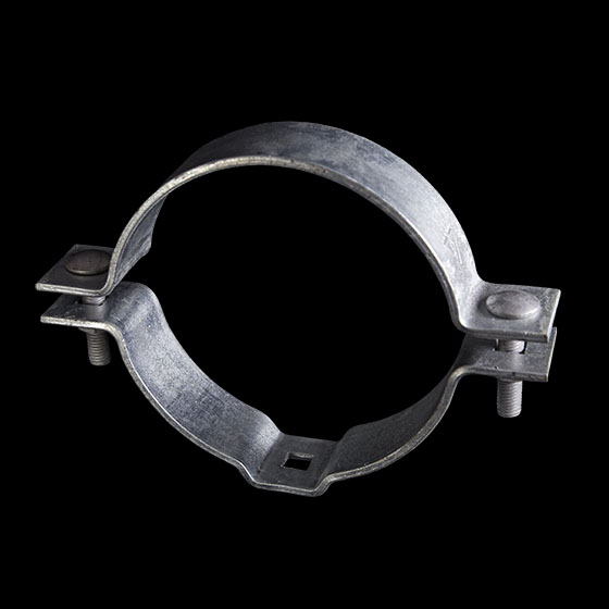 Collarín abrazadera para transformador en diámetro de 220 mm, bajo RETIE y Norma NTC 2663 galvanizado en caliente. Elaborado en platina de 2" o 2 1/2", 3" de ancho x 1/4" o 3/8" de espesor, incluyen los accesorios de ajuste, opcional los accesorios en la salida. Se usan para fijar transformadores eléctricos a los postes.