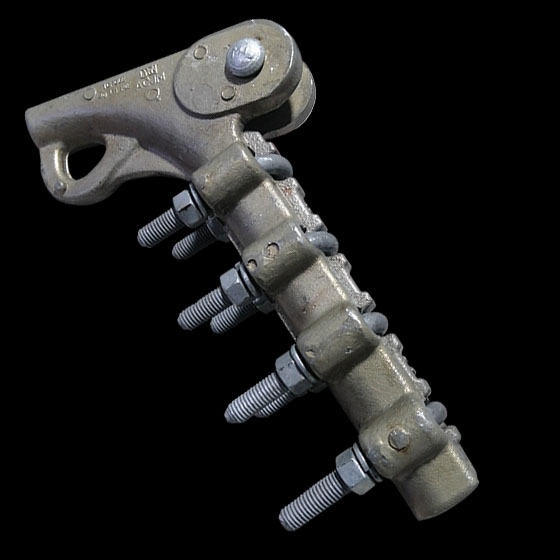 Grapa retención tipo pistola en aluminio para cable desde 1/0 hasta 266 MCM (10,1 mm - 16,3 mm) con 3 pernos en U, fabricado por proceso de fundición de aleación de aluminio basada en norma NTC 2973. Utilizado para la fijación de conductores de aluminio a los aisladores en las estructuras de retención o terminales. Aplicado un esfuerzo longitudinal sobre el conductor, el conjunto describa una traslación paralela.