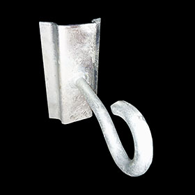 Percha con gancho con base acanalada de 150 mm de largo en espesor calibre 12 o 14 con gancho de ojo abierto soldado, galvanizado en caliente. Se usan para sujetar redes trenzadas aéreas en baja tensión.