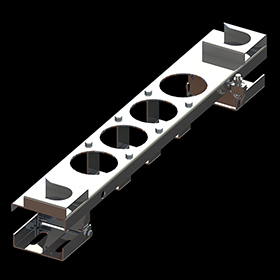 Soporte para barraje de media tensión en acero inoxidable con longitud total de 685 mm utilizado en barrajes preformados 4 vías media tensión en circuitos subterráneos de sistemas de distribución.